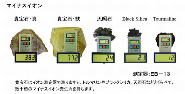 貴宝石とは……….トルマリンやブラックシリカ、天照石などとくらべて 数十倍のマイナスイオン発生力を持ちます。その組成によりたくさんの優れた機能を持ちます。特にマイナスイオン発生力によりインソールへの温熱効果、消臭効果などをもたらしてくれ、日本の大手飲料メーカーや、大手音響メーカーを始め多くの企業に機能性素材として採用されております。